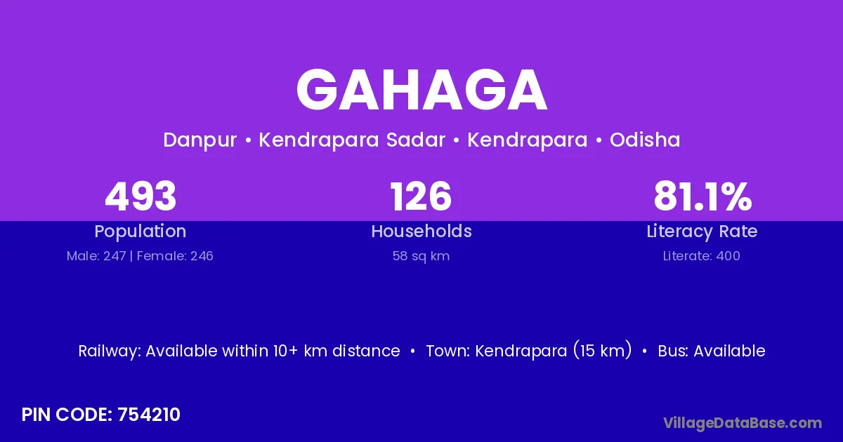 Kendrapara (15 km) is the nearest town to Gahaga village for major economic activities and is located approximately 15 km away.