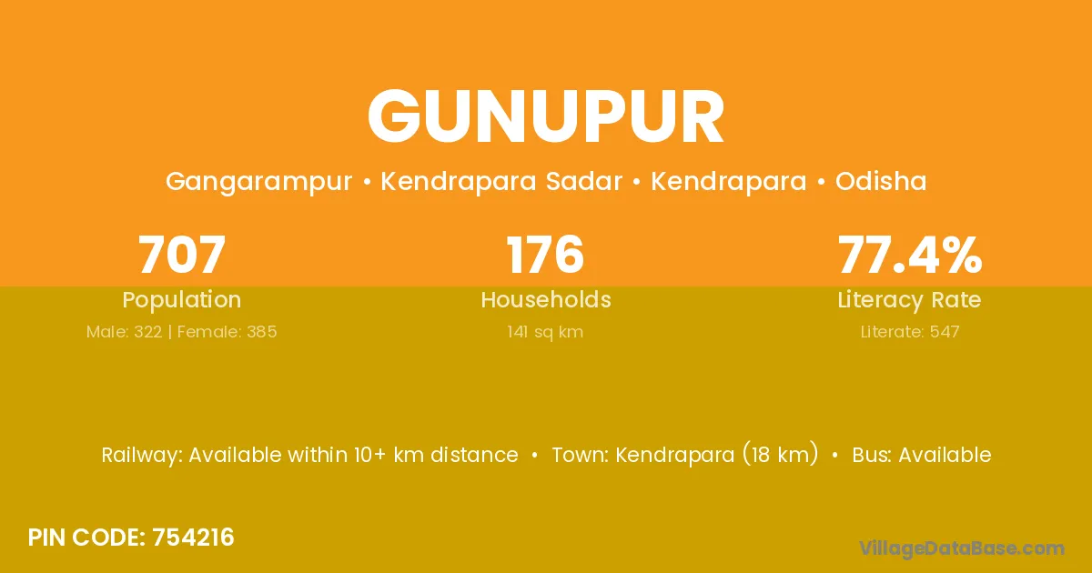 Kendrapara (18 km) is the nearest town to Gunupur village for major economic activities and is located approximately 18 km away.