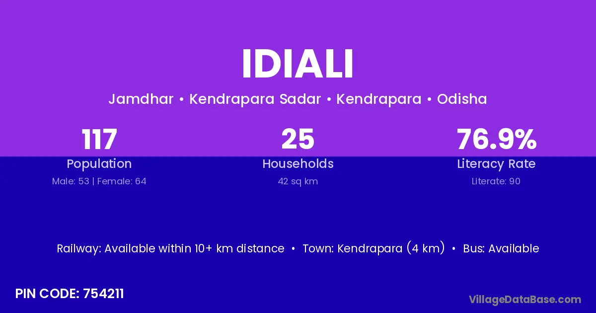 Kendrapara (4 km) is the nearest town to Idiali village for major economic activities and is located approximately 4 km away.