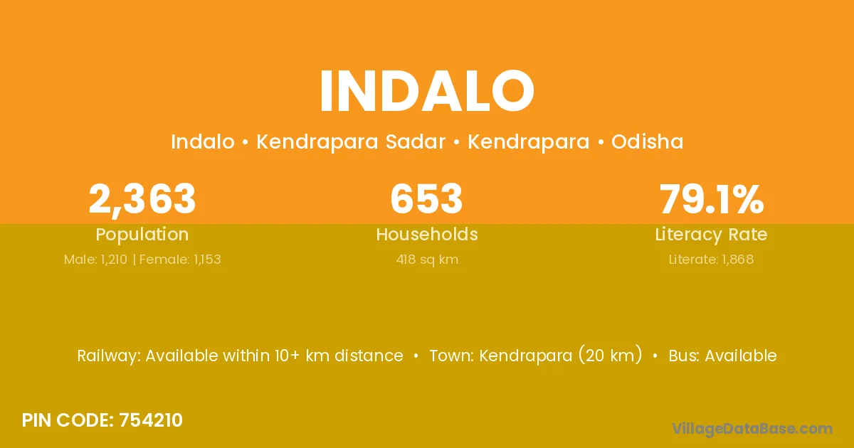 Kendrapara (20 km) is the nearest town to Indalo village for major economic activities and is located approximately 20 km away.