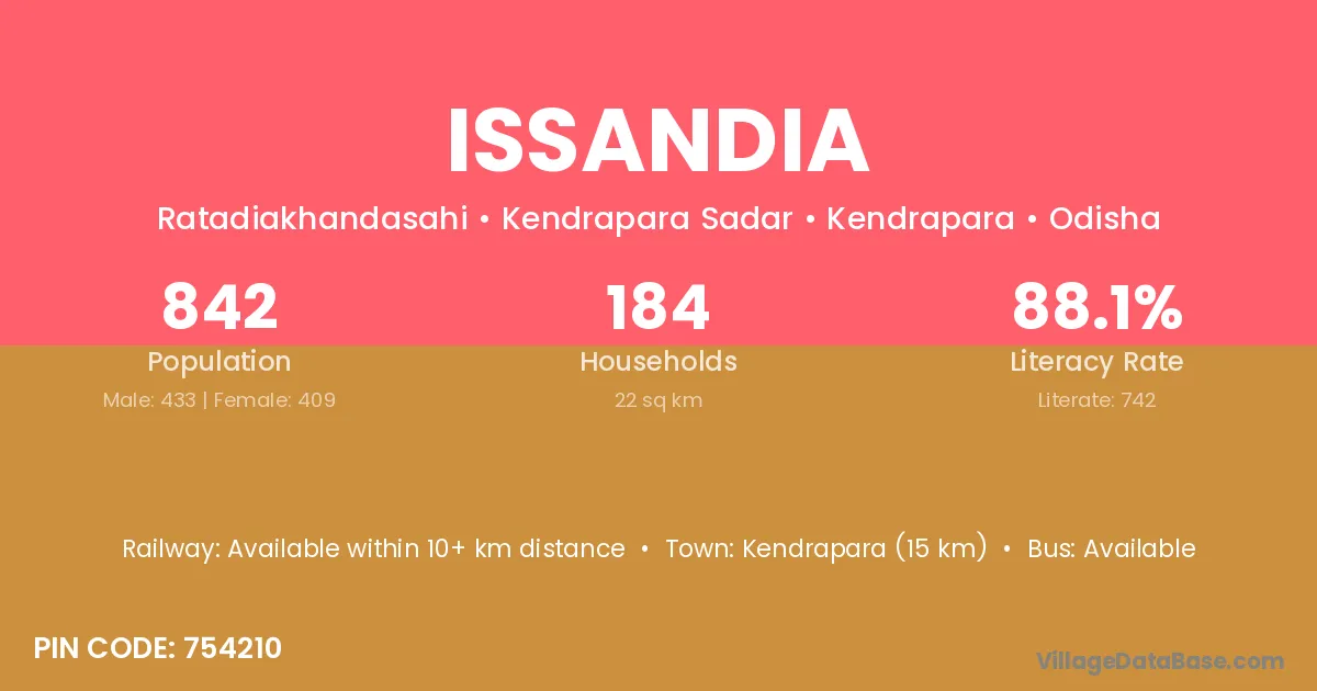 Kendrapara (15 km) is the nearest town to Issandia village for major economic activities and is located approximately 15 km away.
