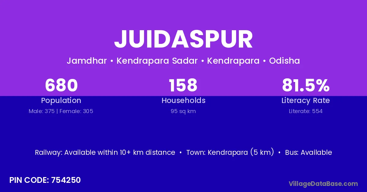 Kendrapara (5 km) is the nearest town to Juidaspur village for major economic activities and is located approximately 5 km away.