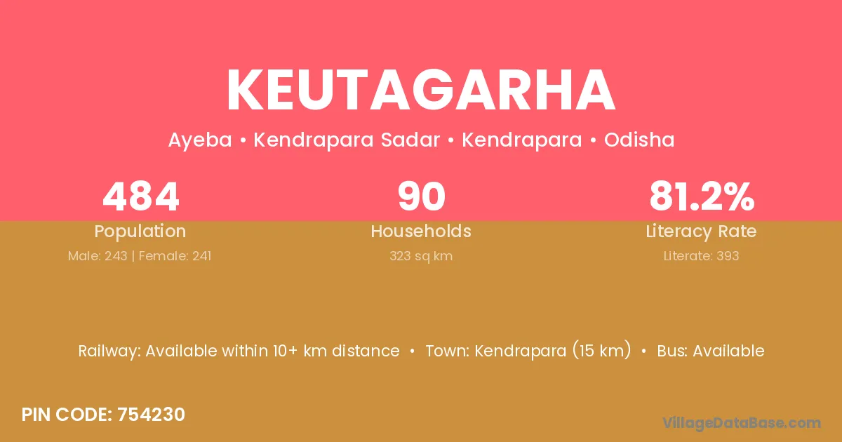 Kendrapara (15 km) is the nearest town to Keutagarha village for major economic activities and is located approximately 15 km away.