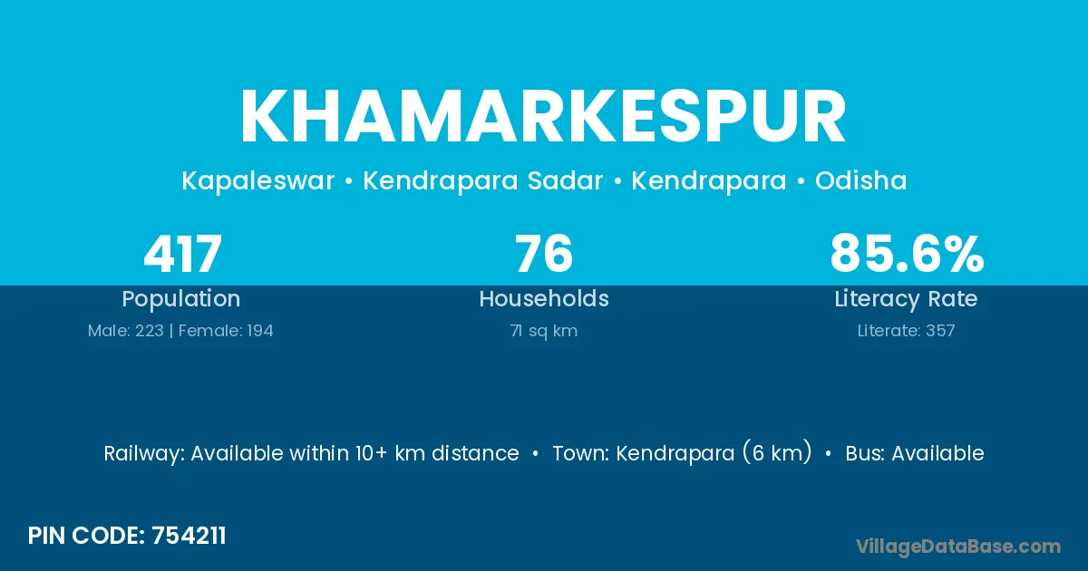 Kendrapara (6 km) is the nearest town to Khamarkespur village for major economic activities and is located approximately 6 km away.