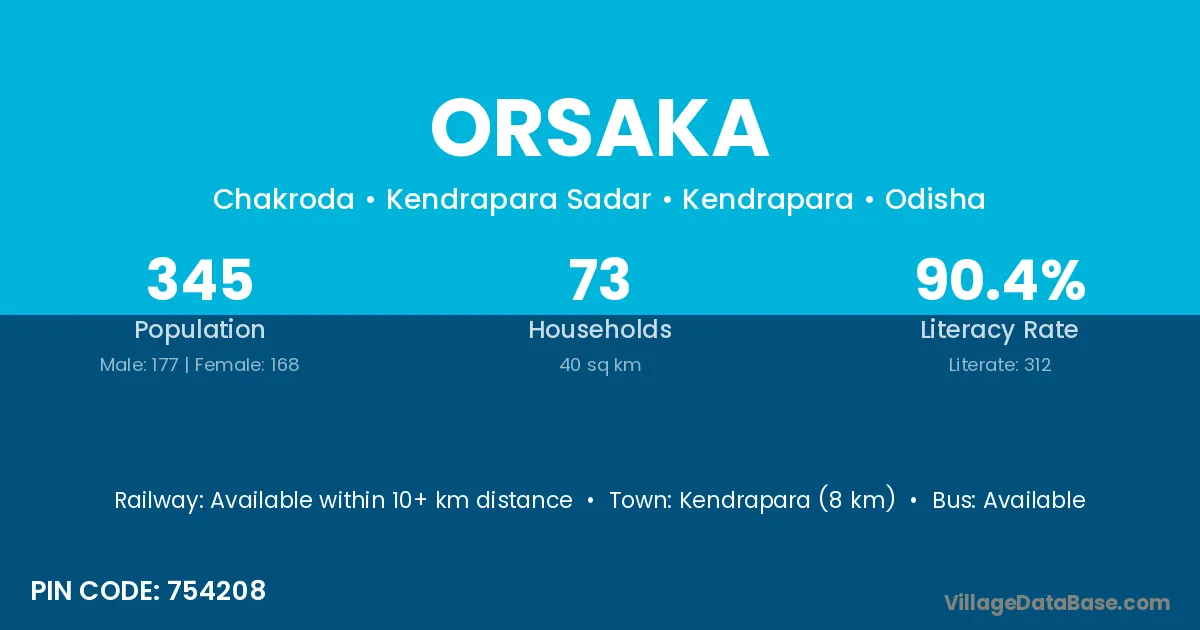 Kendrapara (8 km) is the nearest town to Orsaka village for major economic activities and is located approximately 8 km away.