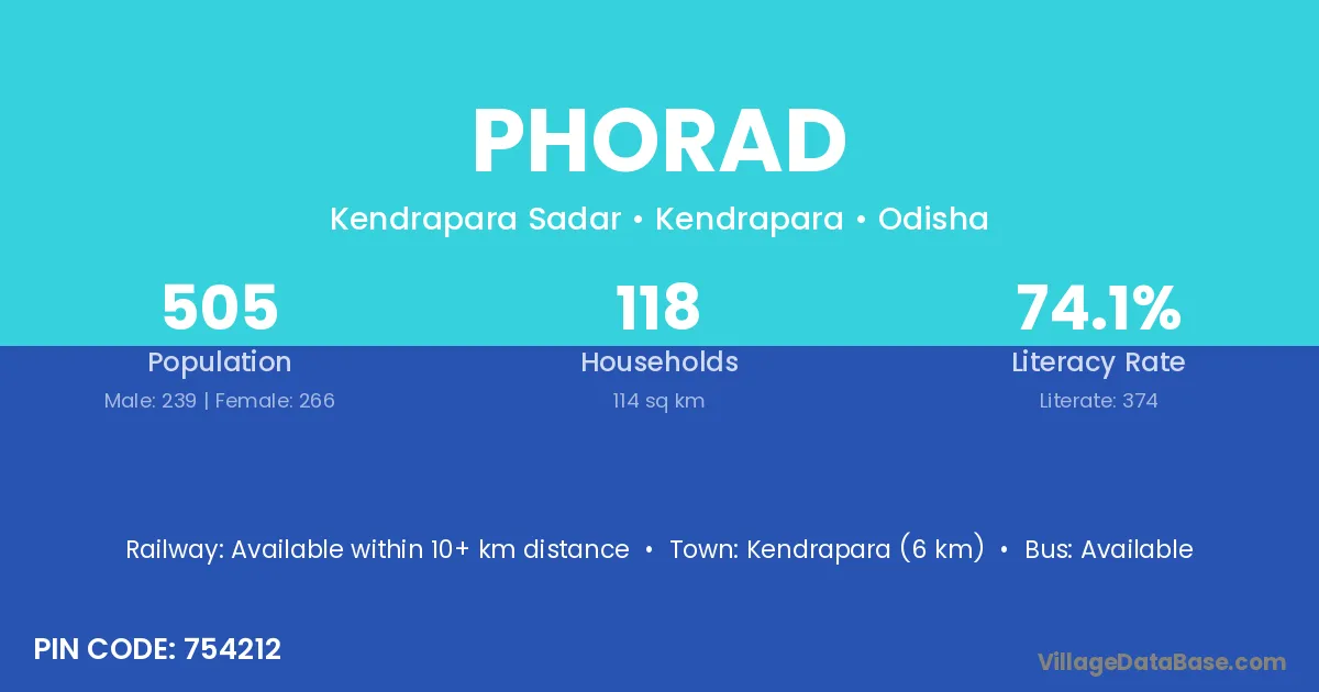 Kendrapara (6 km) is the nearest town to Phorad village for major economic activities and is located approximately 6 km away.