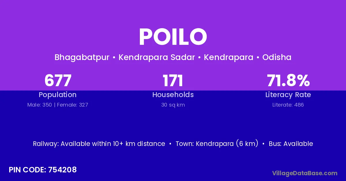 Kendrapara (6 km) is the nearest town to Poilo village for major economic activities and is located approximately 6 km away.