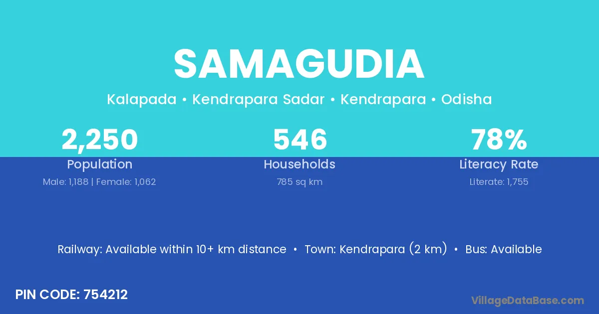 Kendrapara (2 km) is the nearest town to Samagudia village for major economic activities and is located approximately 2 km away.