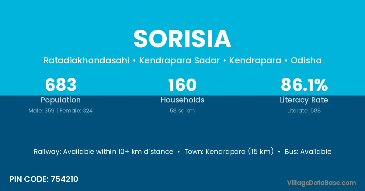 Kendrapara (15 km) is the nearest town to Sorisia village for major economic activities and is located approximately 15 km away.