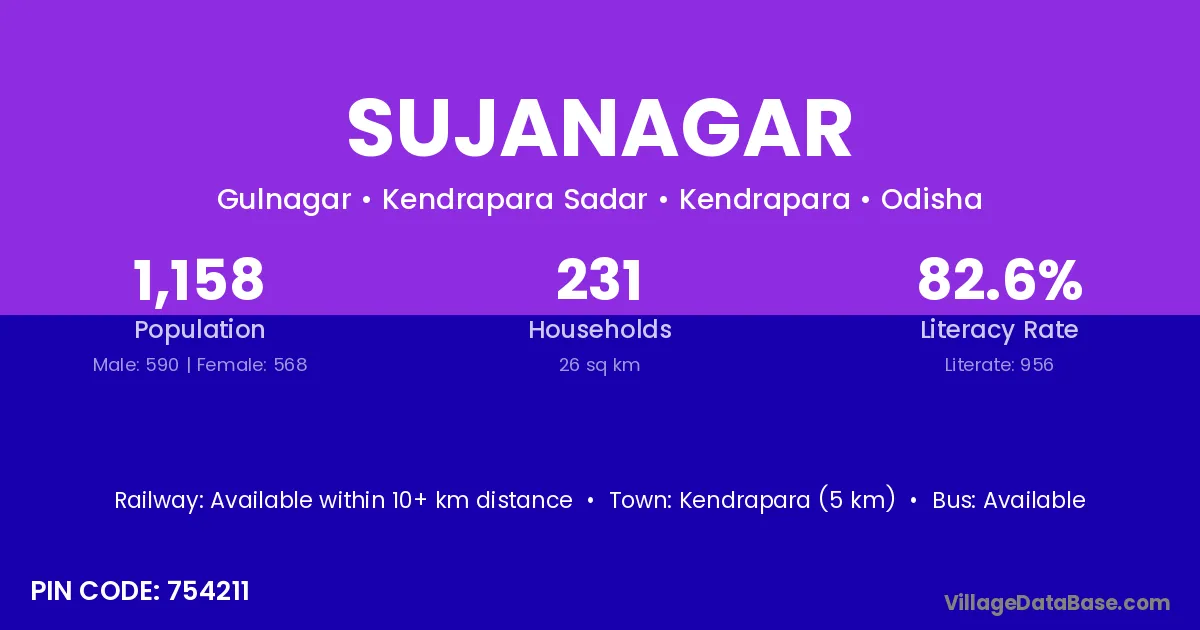 Kendrapara (5 km) is the nearest town to Sujanagar village for major economic activities and is located approximately 5 km away.