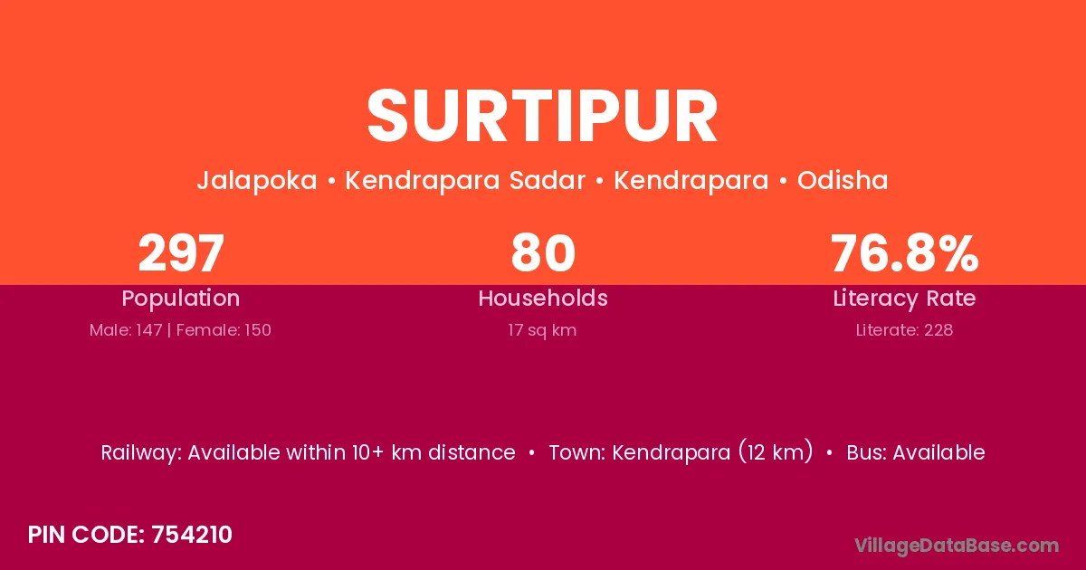 Kendrapara (12 km) is the nearest town to Surtipur village for major economic activities and is located approximately 12 km away.