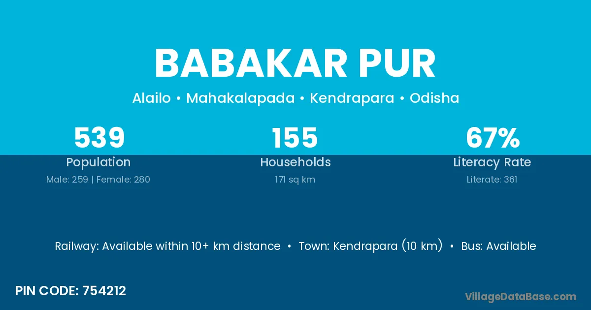Kendrapara (10 km) is the nearest town to Babakar Pur village for major economic activities and is located approximately 10 km away.