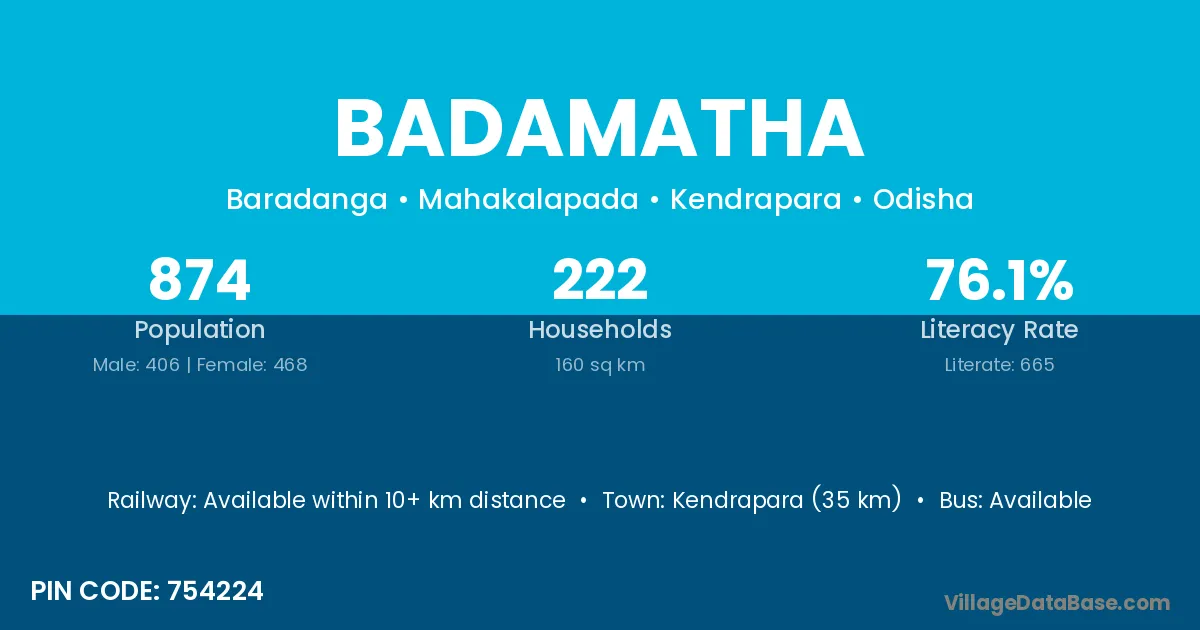 Kendrapara (35 km) is the nearest town to Badamatha village for major economic activities and is located approximately 35 km away.