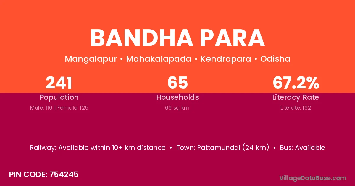 Pattamundai (24 km) is the nearest town to Bandha Para village for major economic activities and is located approximately 24 km away.