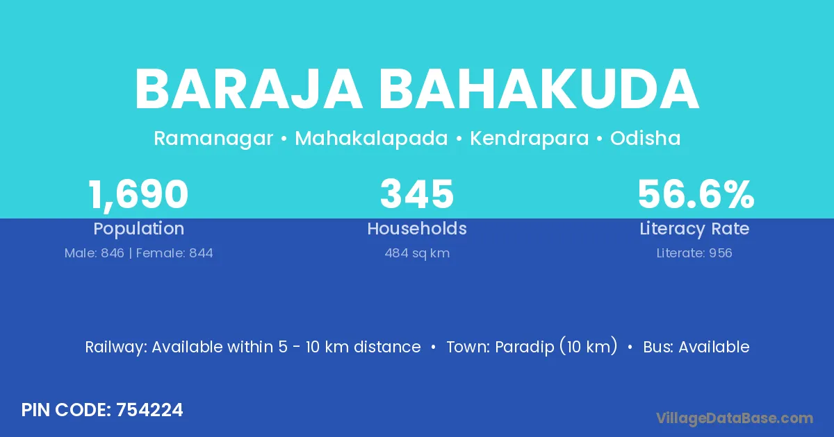 Paradip (10 km) is the nearest town to Baraja Bahakuda village for major economic activities and is located approximately 10 km away.