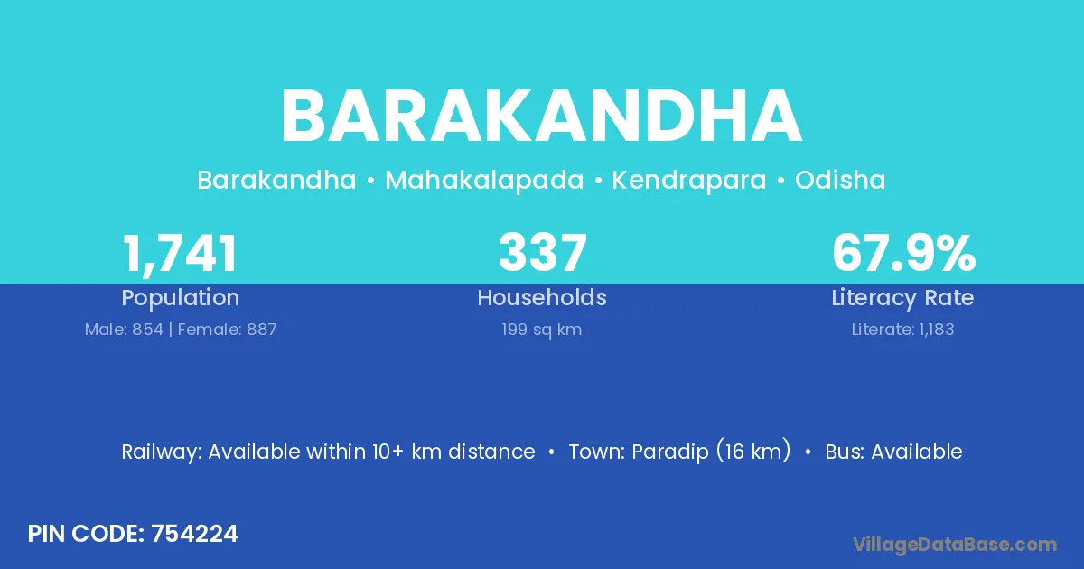 Paradip (16 km) is the nearest town to Barakandha village for major economic activities and is located approximately 16 km away.