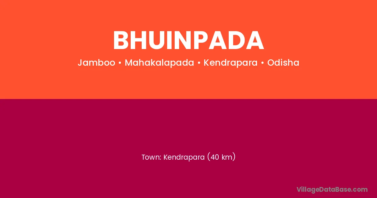 Kendrapara (40 km) is the nearest town to Bhuinpada village for major economic activities and is located approximately 40 km away.