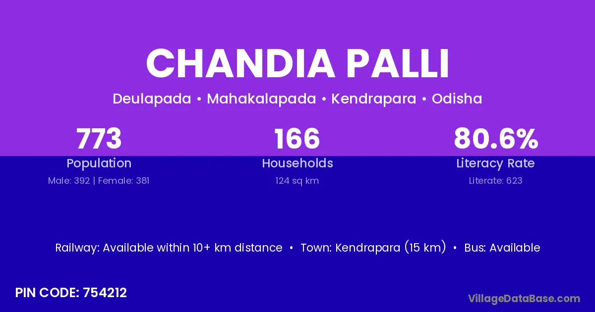 Kendrapara (15 km) is the nearest town to Chandia Palli village for major economic activities and is located approximately 15 km away.