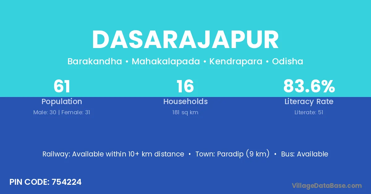 Paradip (9 km) is the nearest town to Dasarajapur village for major economic activities and is located approximately 9 km away.