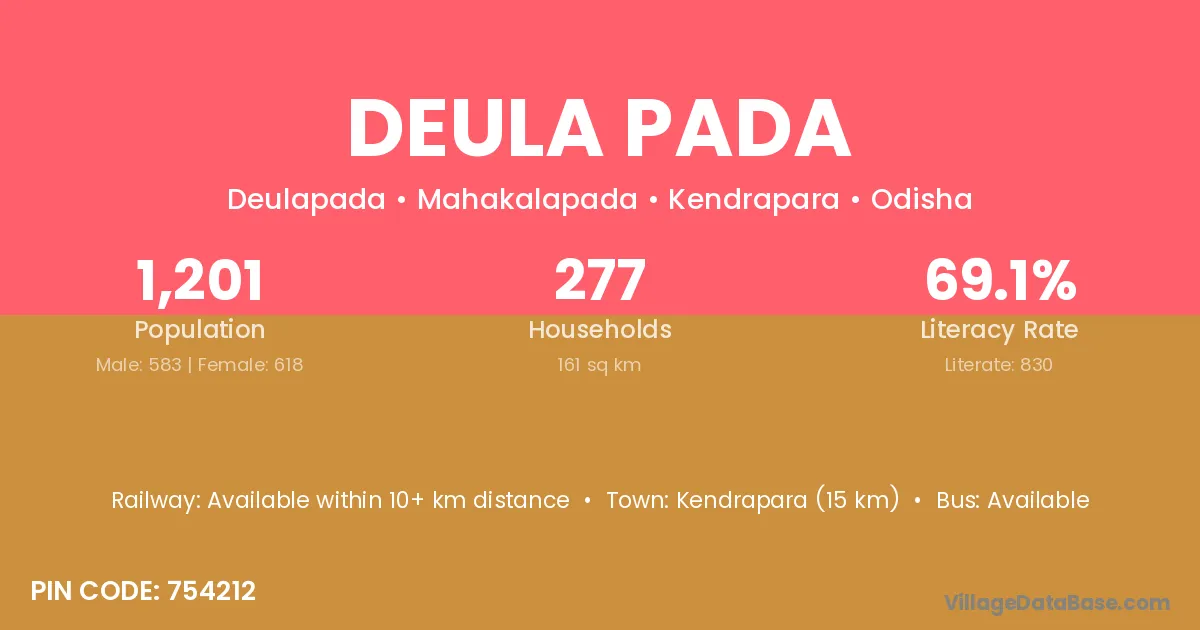 Kendrapara (15 km) is the nearest town to Deula Pada village for major economic activities and is located approximately 15 km away.
