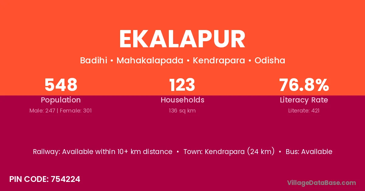 Kendrapara (24 km) is the nearest town to Ekalapur village for major economic activities and is located approximately 24 km away.