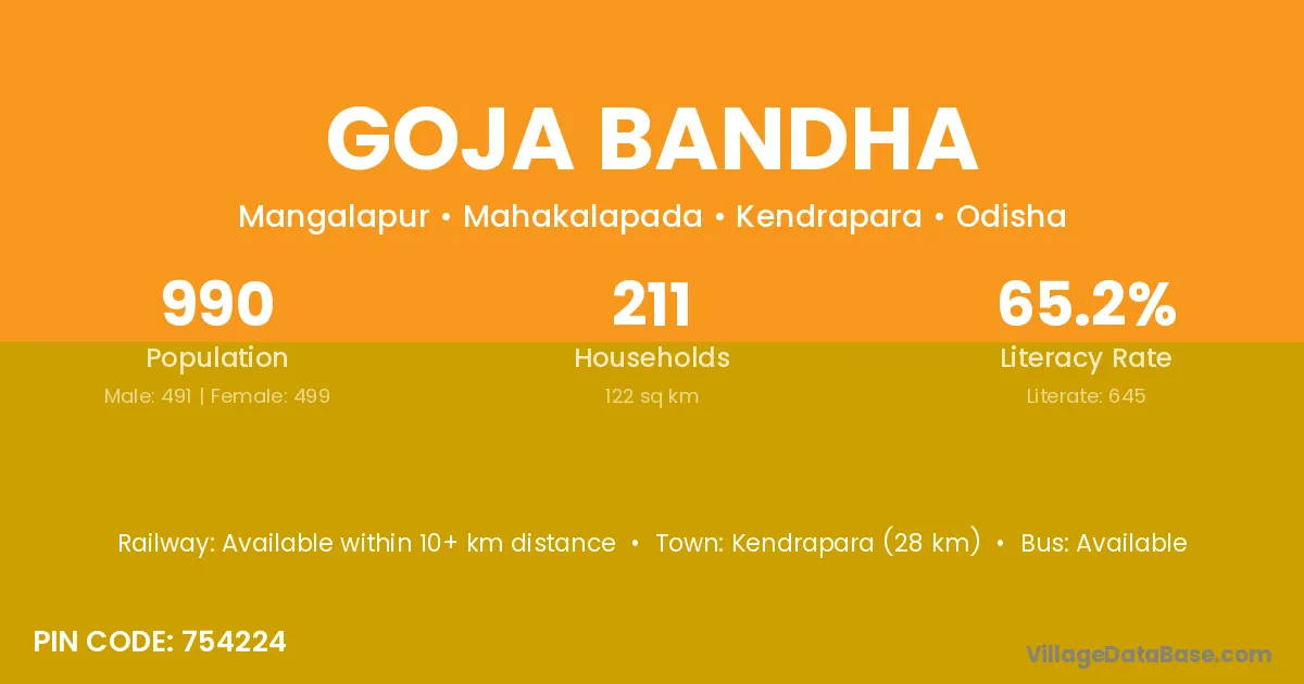 Kendrapara (28 km) is the nearest town to Goja Bandha village for major economic activities and is located approximately 28 km away.