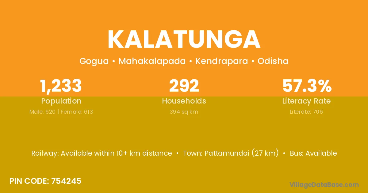 Pattamundai (27 km) is the nearest town to Kalatunga village for major economic activities and is located approximately 27 km away.