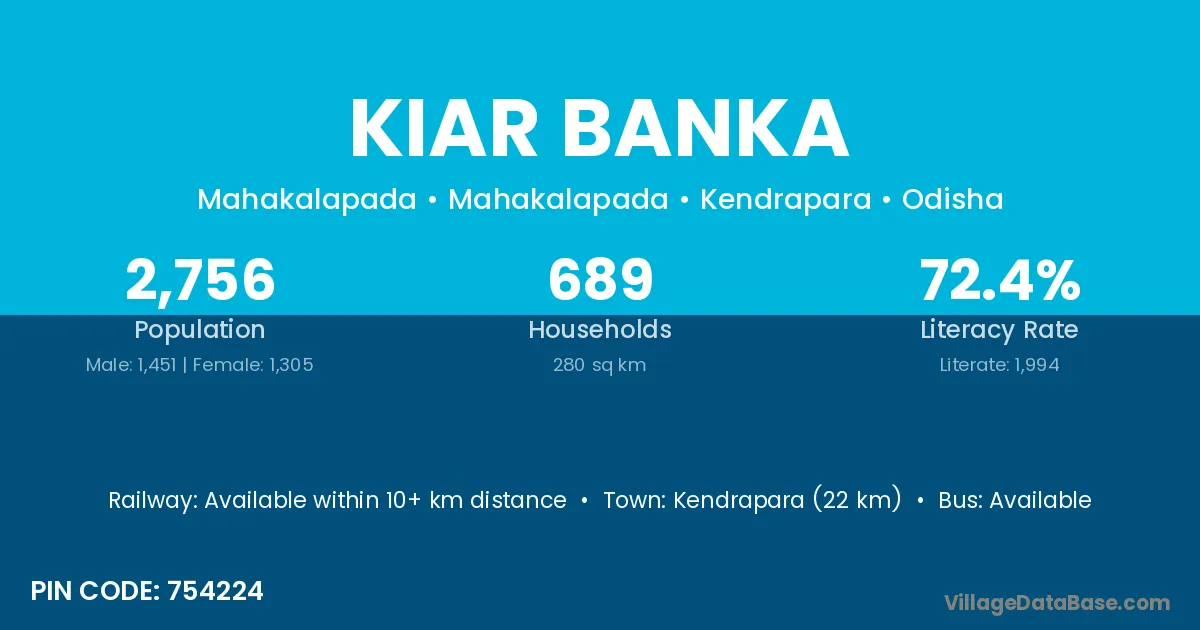 Kendrapara (22 km) is the nearest town to Kiar Banka village for major economic activities and is located approximately 22 km away.