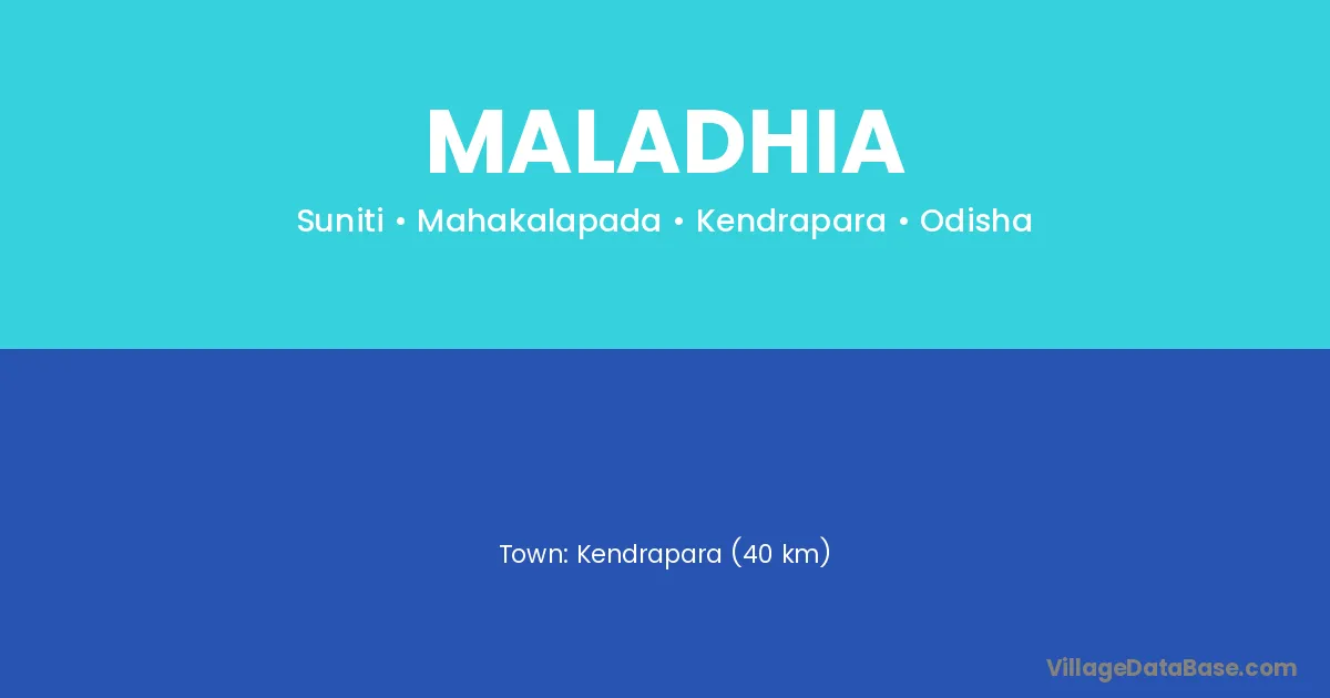 Kendrapara (40 km) is the nearest town to Maladhia village for major economic activities and is located approximately 40 km away.