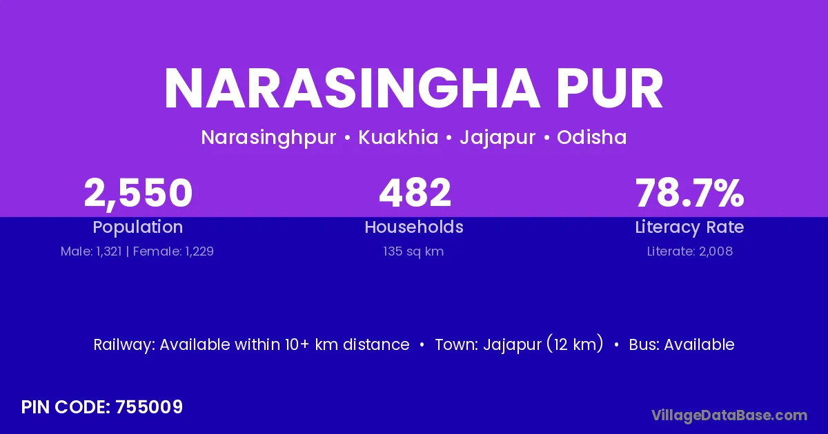 Pattamundai (30 km) is the nearest town to Narasingha Pur village for major economic activities and is located approximately 30 km away.