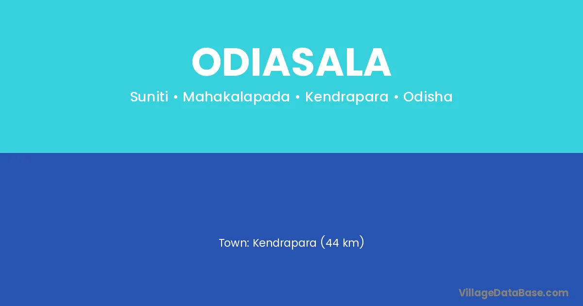 Kendrapara (44 km) is the nearest town to Odiasala village for major economic activities and is located approximately 44 km away.