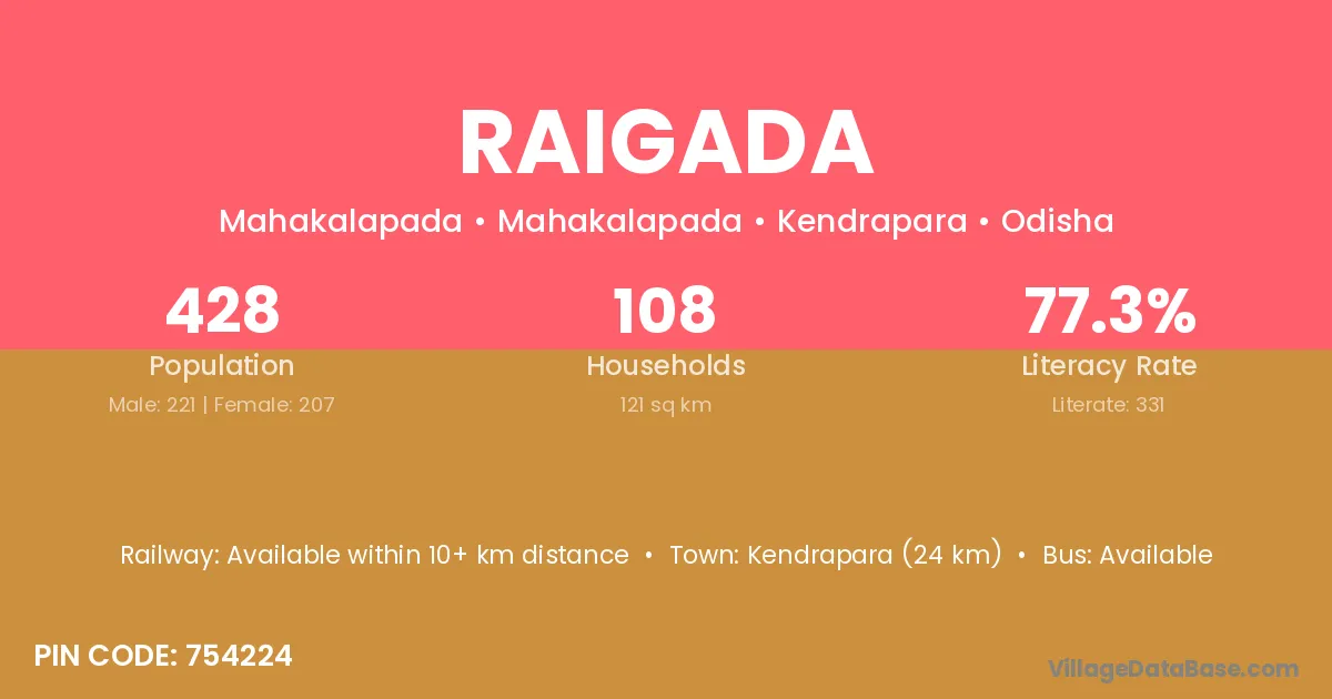 Kendrapara (24 km) is the nearest town to Raigada village for major economic activities and is located approximately 24 km away.