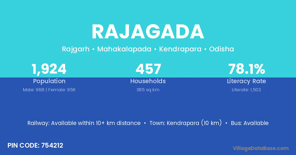 Kendrapara (10 km) is the nearest town to Rajagada village for major economic activities and is located approximately 10 km away.