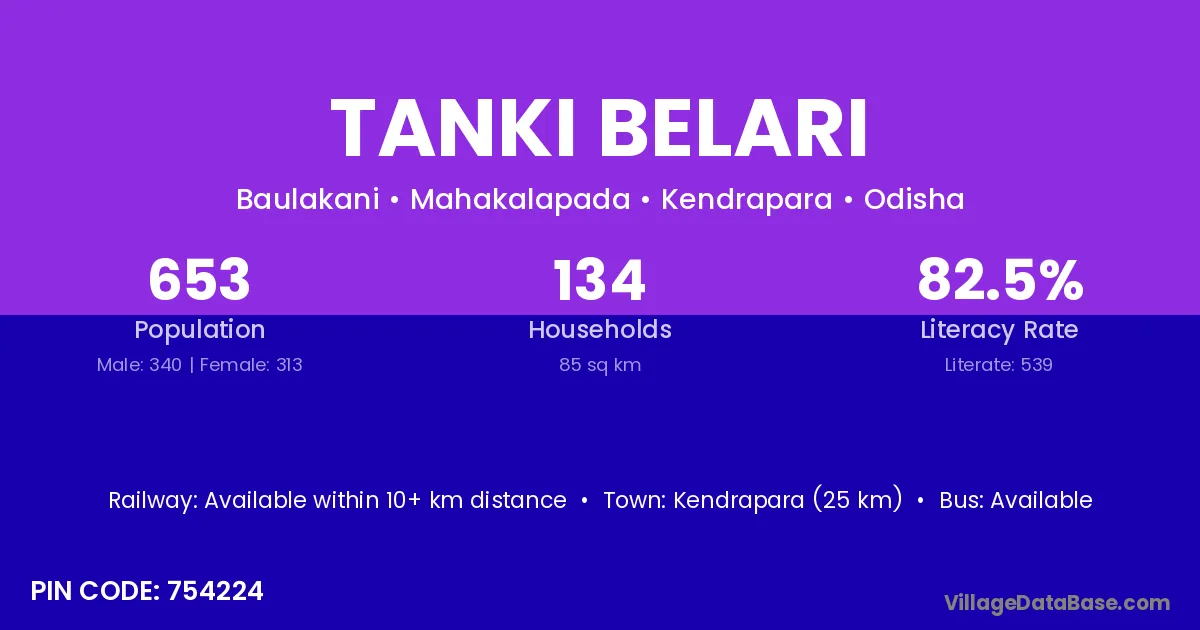 Kendrapara (25 km) is the nearest town to Tanki Belari village for major economic activities and is located approximately 25 km away.
