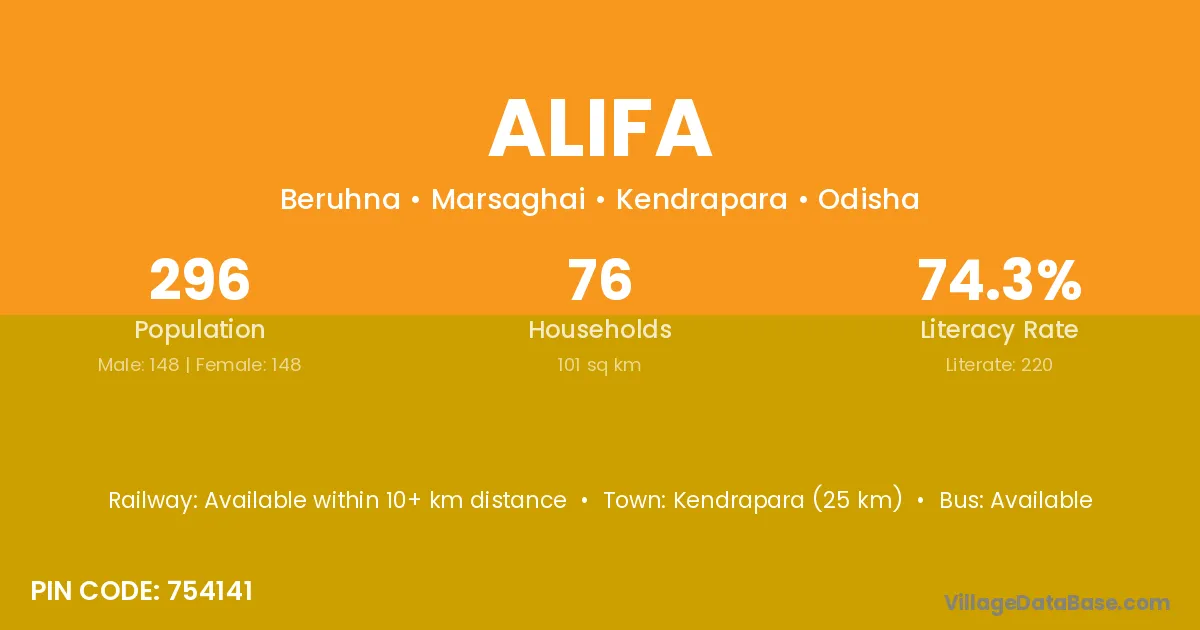 Kendrapara (25 km) is the nearest town to Alifa village for major economic activities and is located approximately 25 km away.