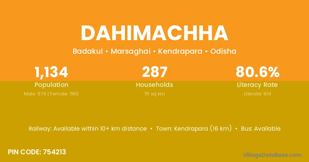 Kendrapara (16 km) is the nearest town to Dahimachha village for major economic activities and is located approximately 16 km away.