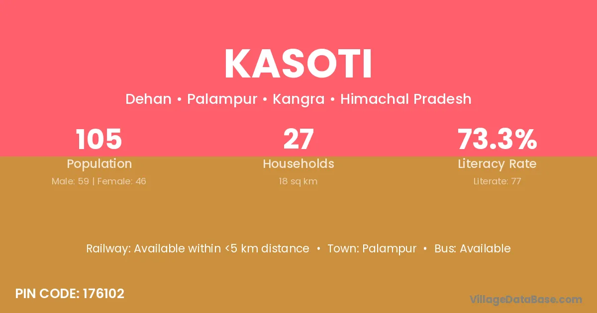 The literacy rate of Kasoti village is 79.64%. Male literacy stands at 84.26% and female literacy at 74.94%.