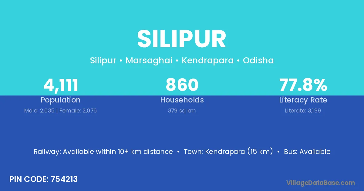 Kendrapara (15 km) is the nearest town to Silipur village for major economic activities and is located approximately 15 km away.