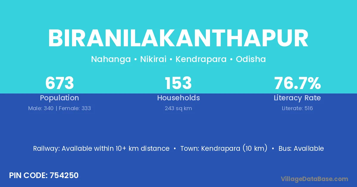 Kendrapara (10 km) is the nearest town to Biranilakanthapur village for major economic activities and is located approximately 10 km away.