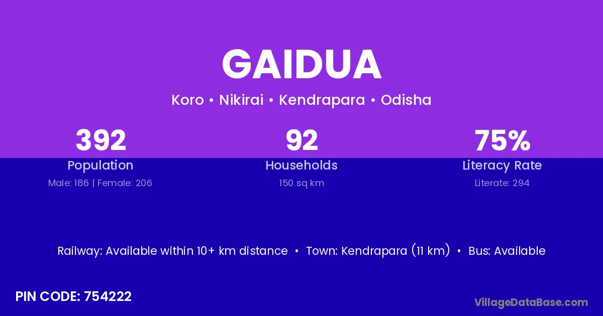 Kendrapara (11 km) is the nearest town to Gaidua village for major economic activities and is located approximately 11 km away.