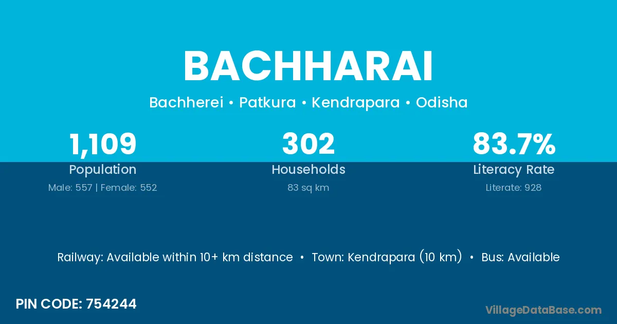 Kendrapara (10 km) is the nearest town to Bachharai village for major economic activities and is located approximately 10 km away.