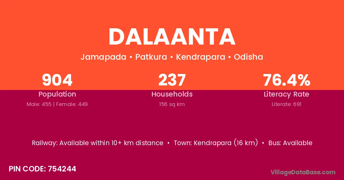 Kendrapara (16 km) is the nearest town to Dalaanta village for major economic activities and is located approximately 16 km away.