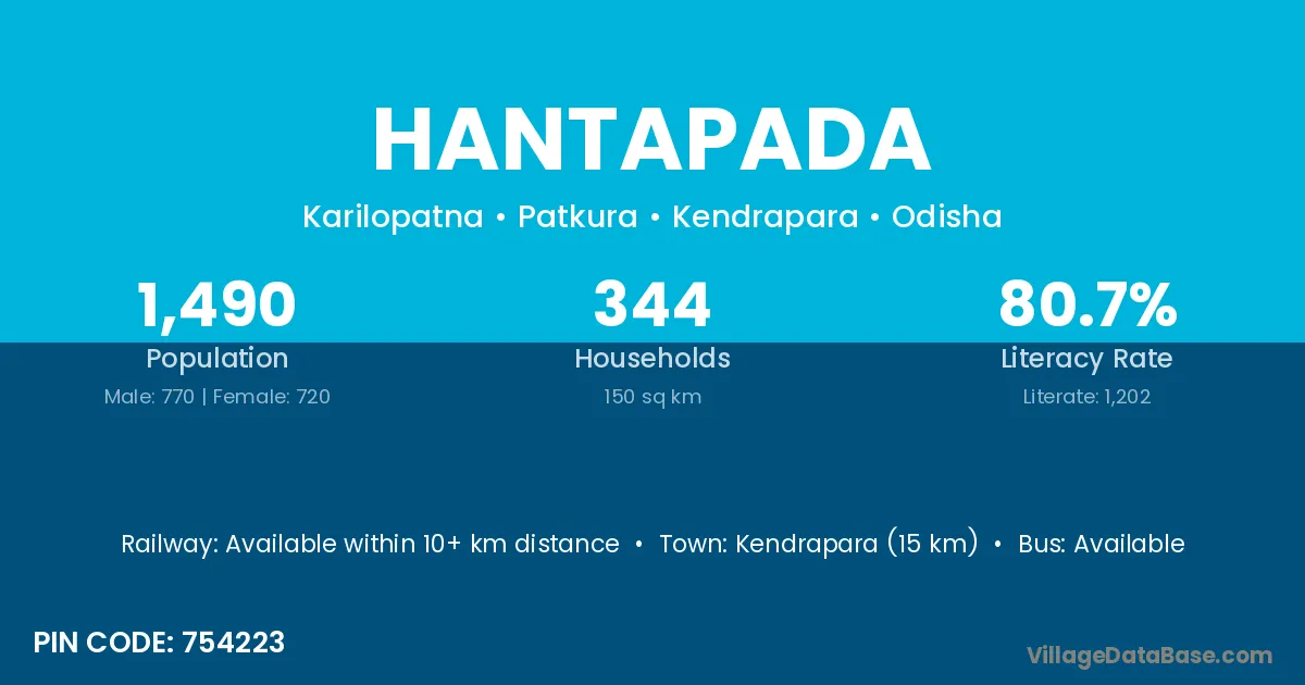 Kendrapara (15 km) is the nearest town to Hantapada village for major economic activities and is located approximately 15 km away.