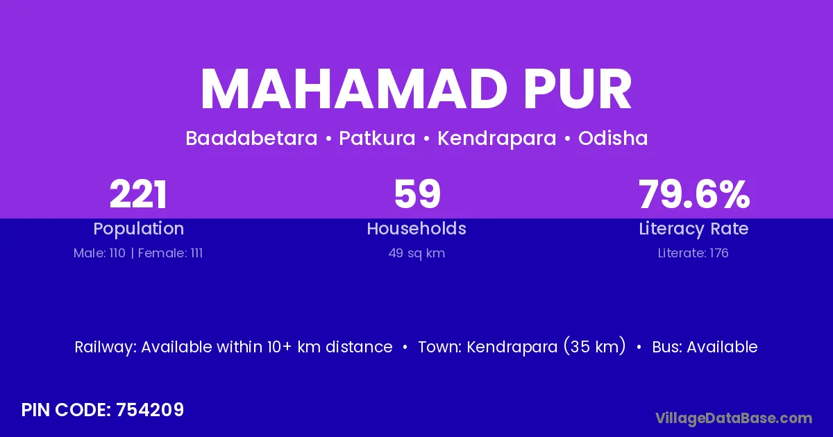 Kendrapara (35 km) is the nearest town to Mahamad Pur village for major economic activities and is located approximately 35 km away.