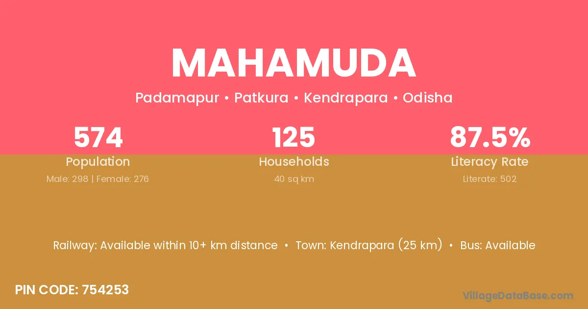 Kendrapara (25 km) is the nearest town to Mahamuda village for major economic activities and is located approximately 25 km away.