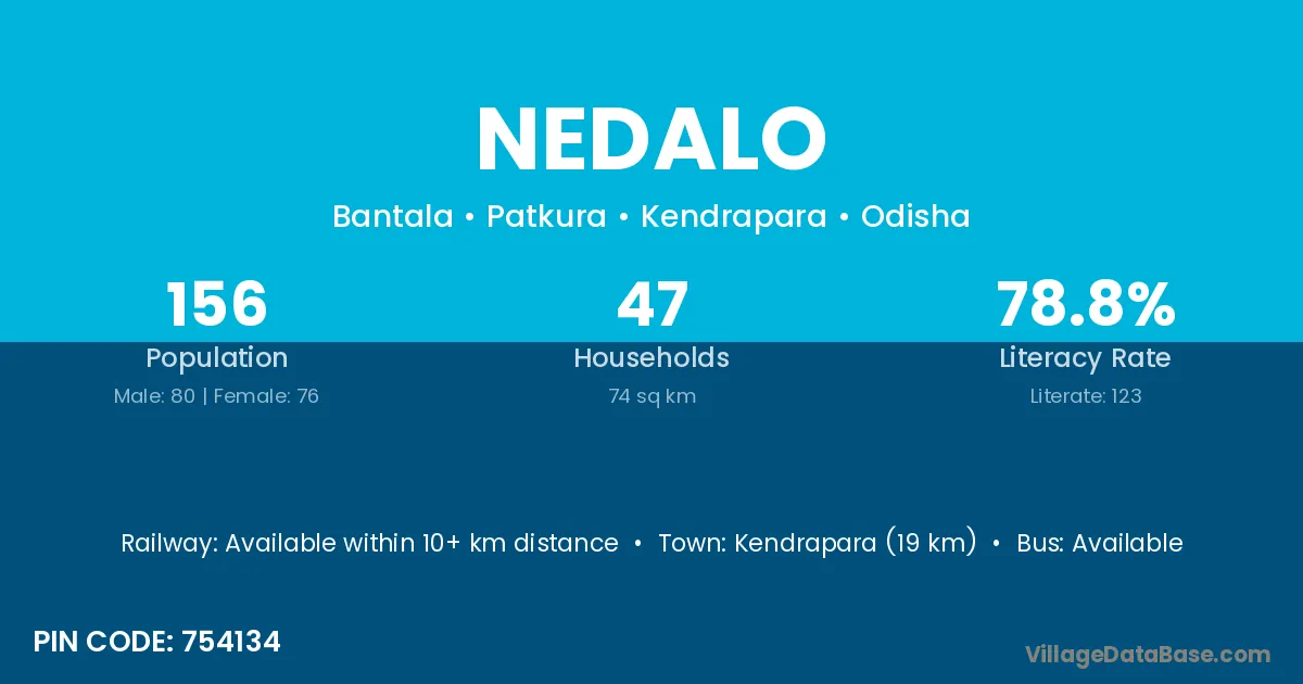 Kendrapara (19 km) is the nearest town to Nedalo village for major economic activities and is located approximately 19 km away.