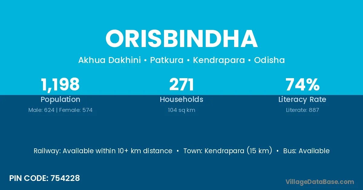 Kendrapara (15 km) is the nearest town to Orisbindha village for major economic activities and is located approximately 15 km away.