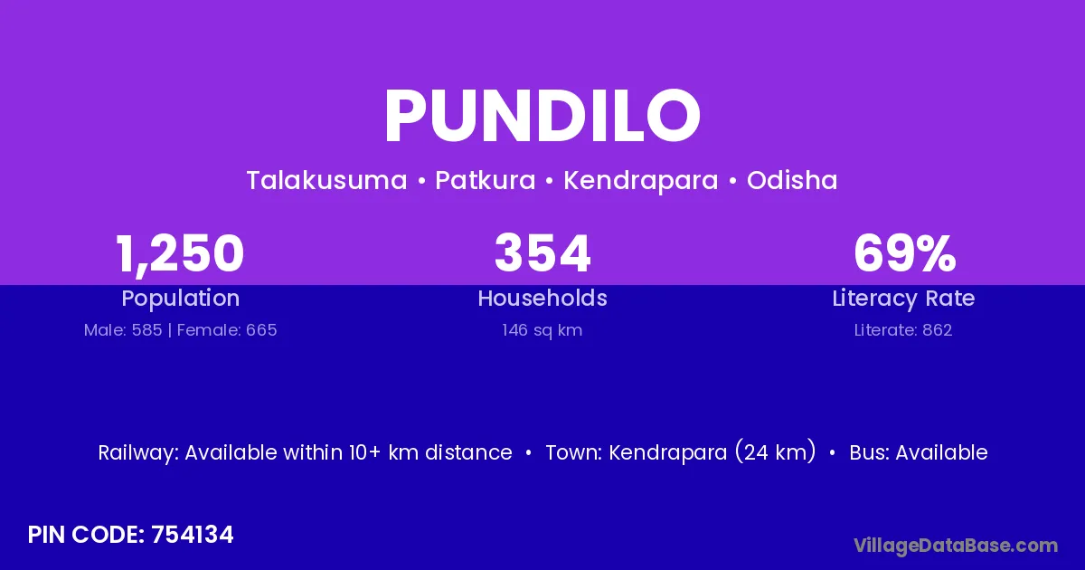 Kendrapara (24 km) is the nearest town to Pundilo village for major economic activities and is located approximately 24 km away.