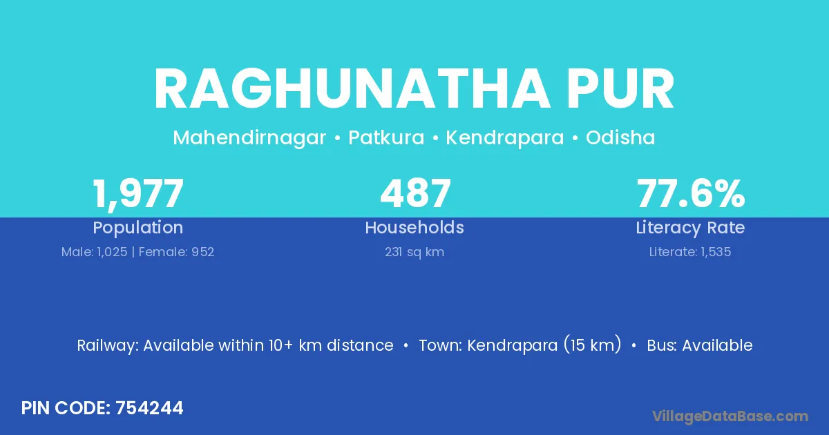 Kendrapara (15 km) is the nearest town to Raghunatha Pur village for major economic activities and is located approximately 15 km away.