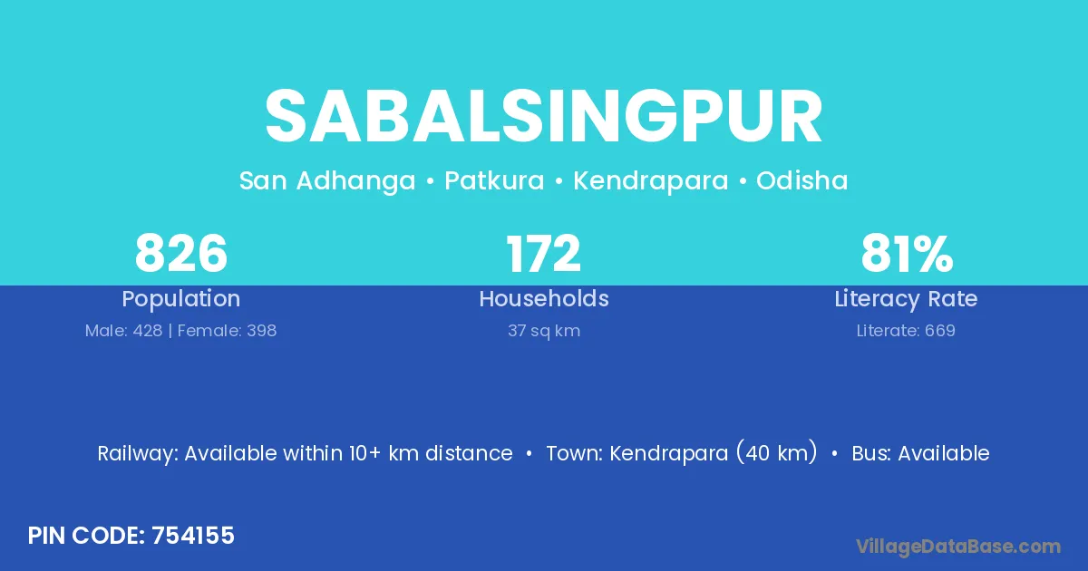Kendrapara (40 km) is the nearest town to Sabalsingpur village for major economic activities and is located approximately 40 km away.